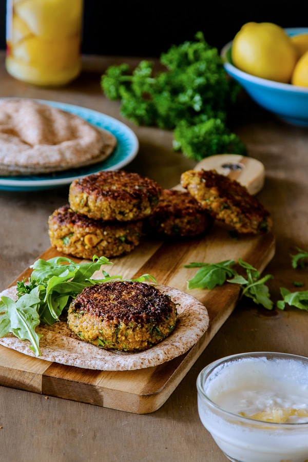 These spiced millet and chickpea burgers are full of fragrant flavor from turmeric, cumin, coriander, and cinnamon. Serve with pita, arugula, and lemon yogurt.