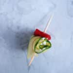 - Roll up the zucchini. Add it below the red pepper on the toothpick.