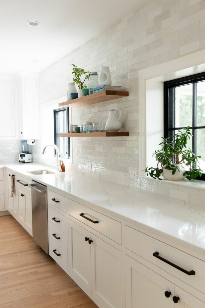 Incorporate a mix of tall and trailing plants in stylish pots. Consider using a cascading vine like pothos or a succulent in a minimalist pot for a clean look. I love petite potted plants, and we have several in our kitchen. Thomas (our resident gardener) sometimes moves the plant for intermittent sun. But generally our kitchen is pretty bright, so they work on the open shelves.