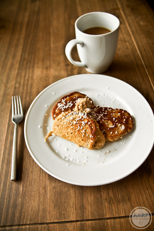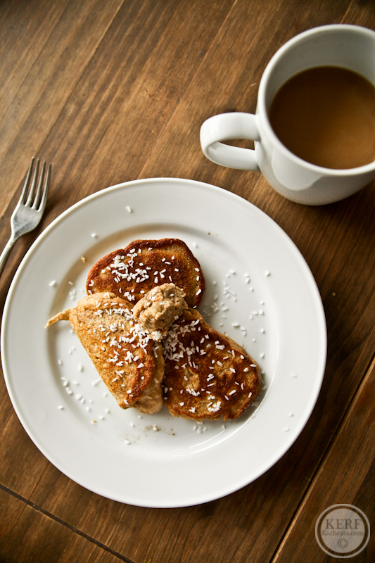 Monday dinner was cornmeal-baked flounder, broccoli slaw salad and chips. Chips because the tortillas for our fish tacos got eaten by mistake over the weekend! Plus, more coconut! The meal is loosely based on a Cook Smarts one – and the sauce on top is a greek yogurt-sriracha blend lightened up from the recommended mayo-based version.