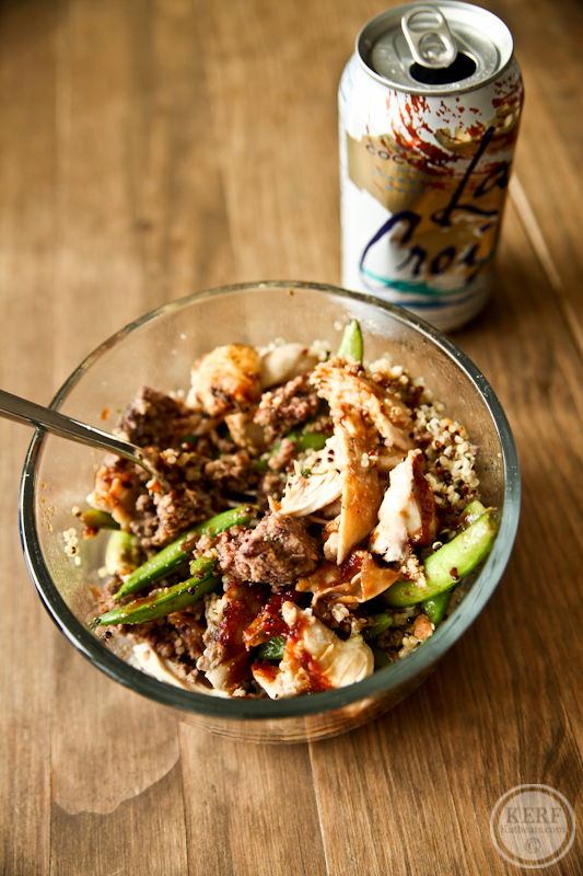 We have so many leftovers in our fridge this week that I’m practicing FIFO – first in, first out. For lunch I used up a cup of quinoa, a black bean burger, some chicken, leftover sugar snaps and a drizzle of BBQ sauce.