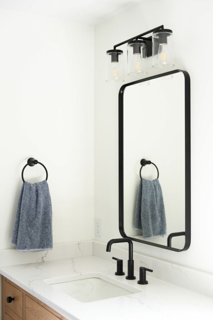 The choice here is the Rhodes Triple Tube Sconce! Similar to the pendant lights in the kitchen, I like the straighter (not tapered) glass and prefer tubes to globes. We debated doing sconces on the sides, but since we have a window between our mirrors, we thought that might be too many things in a row. So above the mirror was the vote.