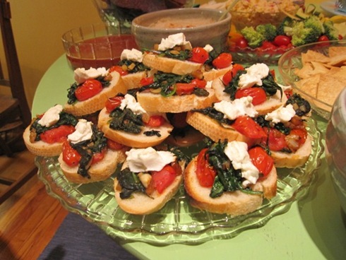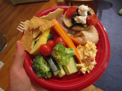 I photographed my first plate – mostly veggies with dips and a goat cheese / spinach / tomato crostini and a few pita chips