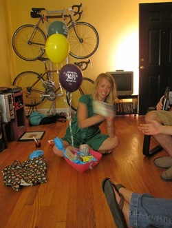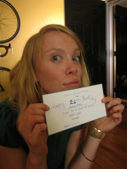 Kelsey opened gifts. I was so busy making cupcakes that I didn’t make it to the store 🙁 I gave her a coupon for drinks on me after class one night!