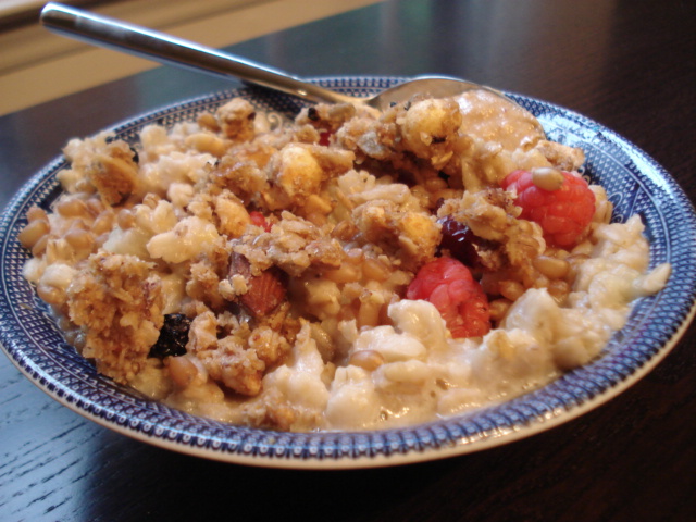After a quick shower + dressing, I’m now enjoying a delicious Monday morning bowl of oats made with 3 different fruits (banana, rasp + blueberry) and 3 grains (oats, wheatberries, plank).