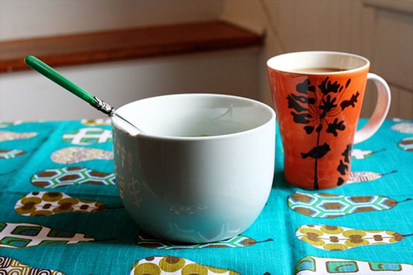 By the way, I’m kind of obsessed with your tablecloth and mug. So pretty! Do you remember where you got that tablecloth?