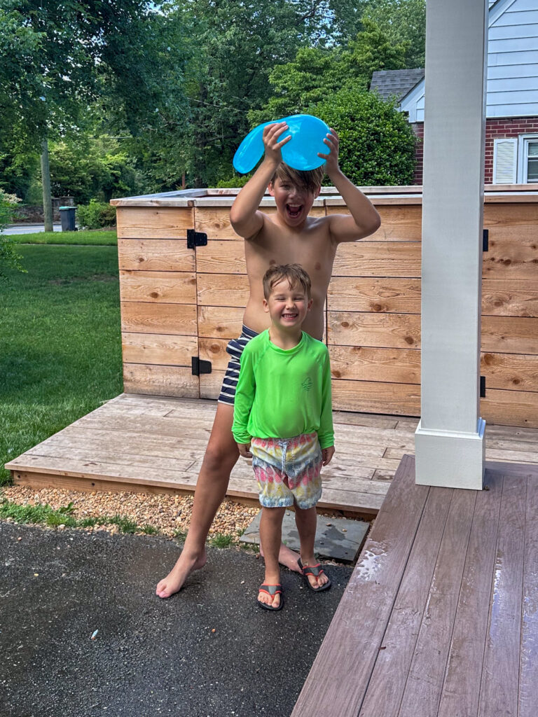 No matter how much I encourage the boys to use their reusable water balloons, they insist on the bunches you fill in bulk or giant balloons to make huge water babies with. Here they are with a giant water “baby” swinging in the hammock.