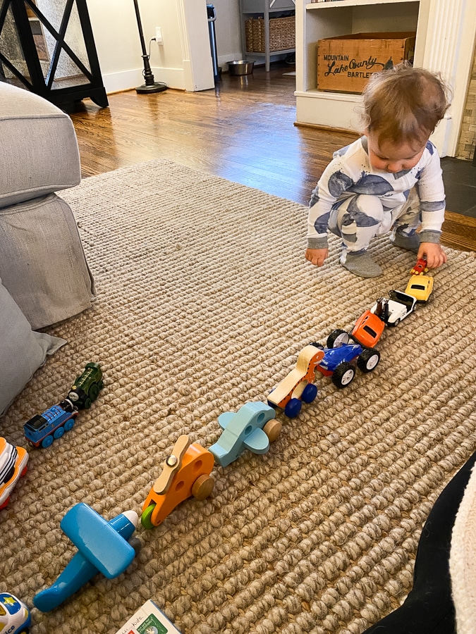 One of my house rules is that we must tidy up one room before we move to another. If we’ve been playing in the living room, we have to straighten it up before moving to the basement. Occasionally we leave toys set up (like our trains) if it’s something elaborate, but all small pieces must be picked up. I believe that modeling is the best tool here. This might take 10 years but every bit helps. I always offer to help the kids clean up their toys when they’re finished playing, but I don’t do it all for them. We sing the “clean up clean up” song as we do it, and I do think that helps Birch understand what’s going on. I’ve noticed he will tidy up a batch of toys (or tupperware!) after he’s splayed it all out on the floor. Mazen knows the only rule for building a fort is that he has to put the couch back together before the day is done, and he’s old enough now to do it by himself.