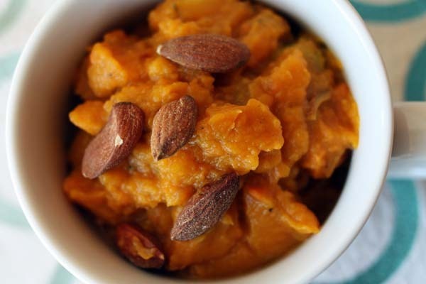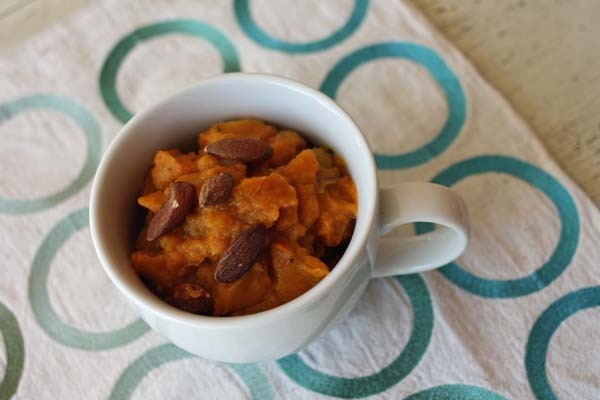 And on the side, a cup of leftover sweet potato soup with roasted veggies mixed in and a few almonds on top.