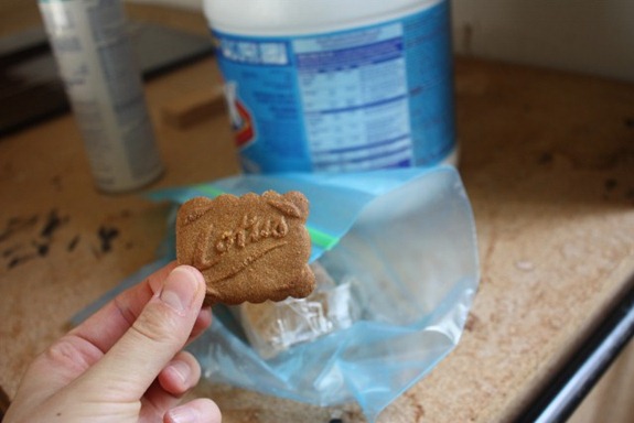 Noontime starvation crisis avoided with the only thing left in our fridge: a frozen roll of Biscoffs! I had 3