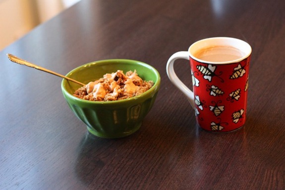 Tell that sore throat to leave you alone! Oatmeal looks great! Guess you will just have to have a coffee pouring 101 class with Matt….te he!
