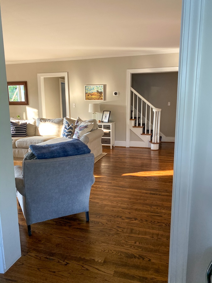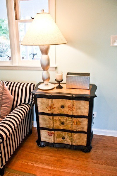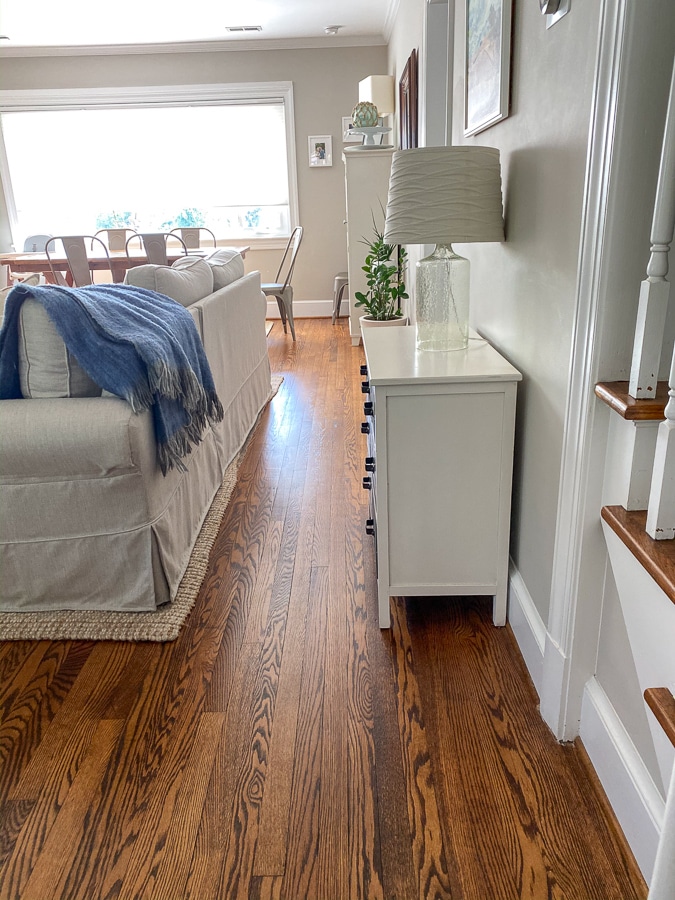 I did a little furniture shopping lately to find a great entry table for our house. Luckily I was able to find the right piece in our bathroom! Above is the after – a clean line to walk by. The previous table (below) had a decorative edge that jutted out just a bit making one feel a bit claustrophobic walking by. In addition to improving the walk-through, the drawers and aesthetics look better with the pieces swapped. I LOVE an easy little home project like this, so once I made the decision to switch them I couldn’t wait to get started. So excited that I forgot to take a before pic of the downstairs room.