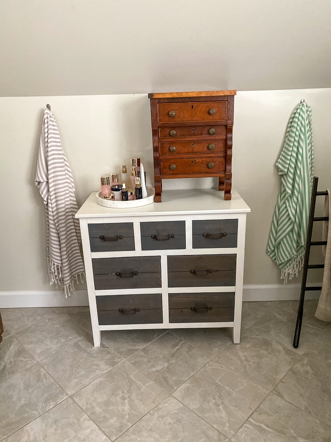 Our bathroom is quite bland in color, so I thought the pop of color would look better in here. I was right! (The little chest, which was my grandmothers, is now on the other side of our bedroom.)