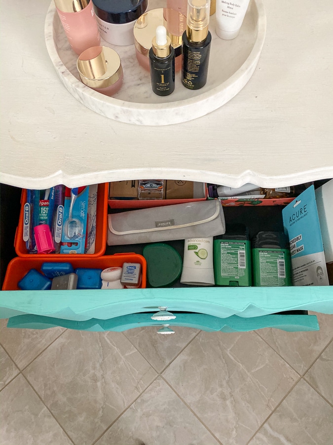 The drawers have been organized and hold extra bathroom things like Q-tips and toothbrushes.