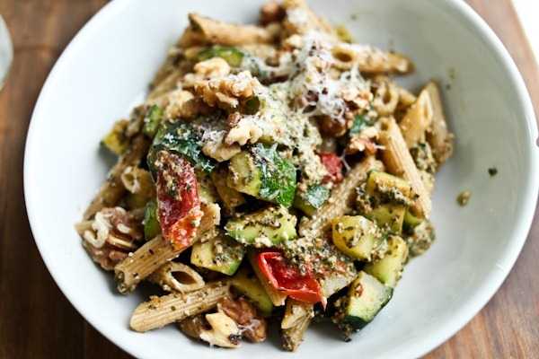 Whole wheat pasta, cooked, and tossed with cooked zucchini and tomatoes, about 1/2 a cup of delicious grass-fed ricotta cheese and about 1/3 cup homemade pesto. Walnuts and parm cheese on top!