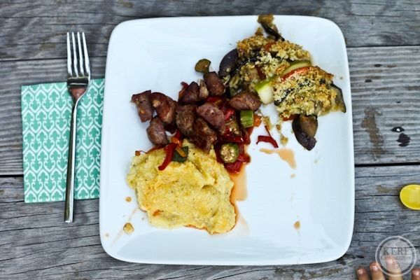 For the main course Matt and I made Andouille with Peppers, Okra and Grits. The Andouille was from the Rock Barn and we cooked it until it had a nice brown crust. The peppers and okra were from the city market and they were cooked in the andouille’s oils. And the grits were by Wade’s Mill and were cooked to perfection in my rice cooker!