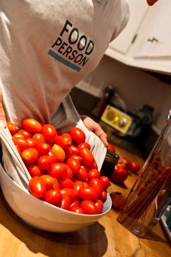 I have been loving sweet ‘n spicy slow roasted tomatoes lately! Cut the romas in half, toss with olive oil, honey and red pepper flakes. Put on a cookie sheet covered with parchment paper and bake for a few hours at 250*. Really great on sandwiches, in pasta, etc.