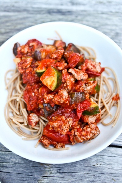 Delicious summer vegetables were seared in a pan with a can of tomato paste: zucchini, eggplant and about a dozen of those tomatoes. We added dashes of Italian seasoning, salt and Garlic Gold for more flavor depth, but let the maters do the talking.