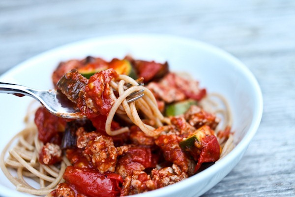 You don’t have to simmer it quite as long as the recipe says – we’ve made shortcut versions with less liquidy tomatoes