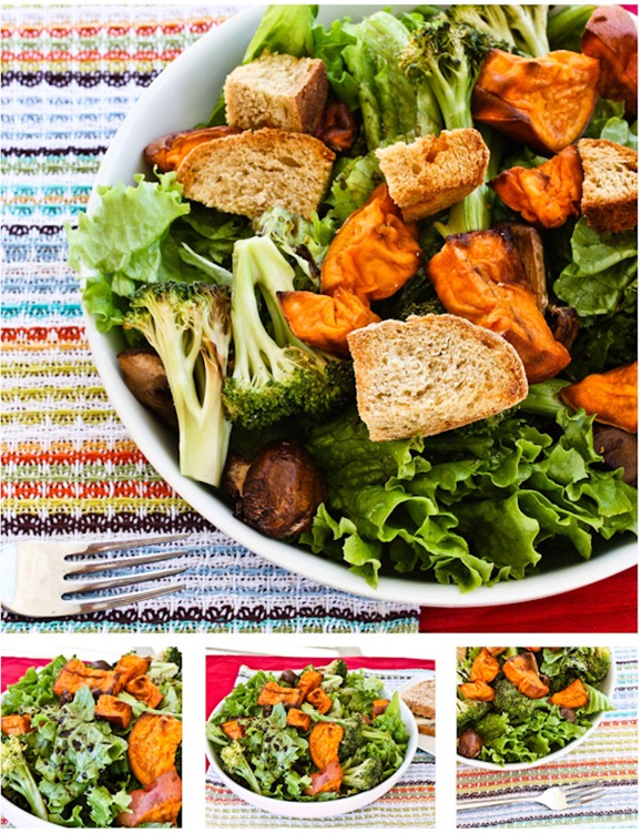 Plus a big green salad with leftover sweet potato, broc and shrooms, my usual dressing and some Cheddar Garlic Croutons!