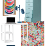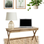 I love the rug and framed art in the Bold and Bright office! My “office” is just a folding table in the living room. I’m lucky enough to have been able to borrow a varidesk lifting desktop from work before we all started to work from home last year, so I have the option to sit or stand throughout the day. It’s a little rickety on top of the folding table, but it gets the job done!