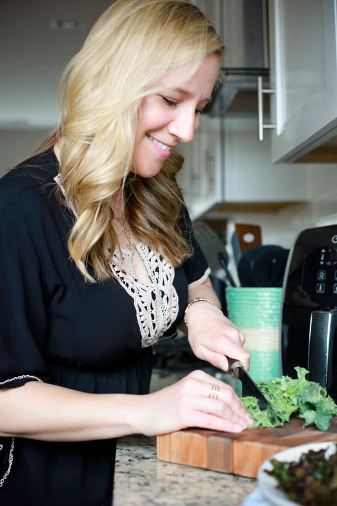 If you had a super large head of kale, you might need to split into two batches. Shake the basket halfway through cooking. The chips will be done when kale is crispy at the edges.