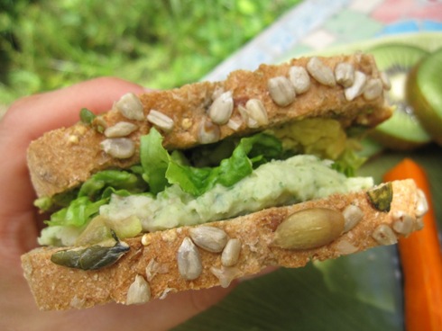 I slathered hummus, pesto, avocado and lettuce on two pieces of Dakota bread for lunch.