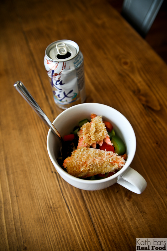 Then, lunch. Leftover rice salad with leftover salmon on top!