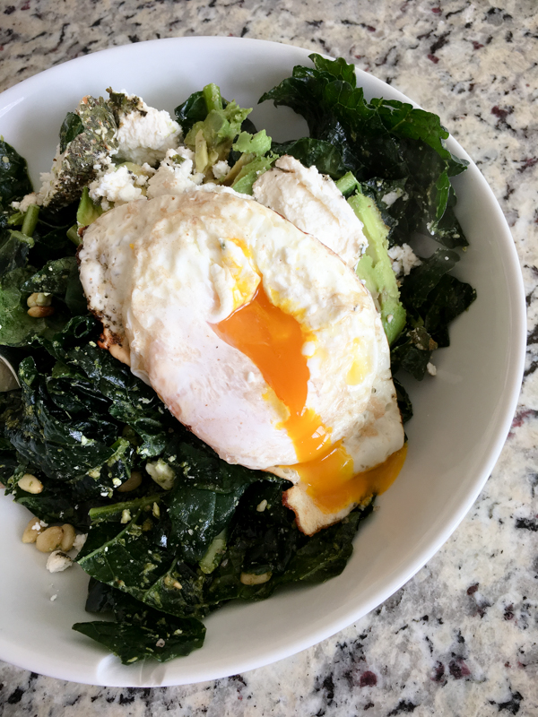 Drippy egg kale salad with Caromont Farm goat cheese, avocado, pine nuts and pesto.