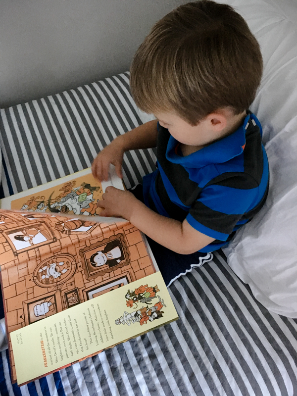 Mazen has been studying up on Frankenstein and practicing his monster walk! My mom got him this book, which he loves.