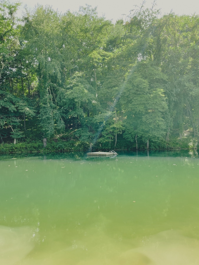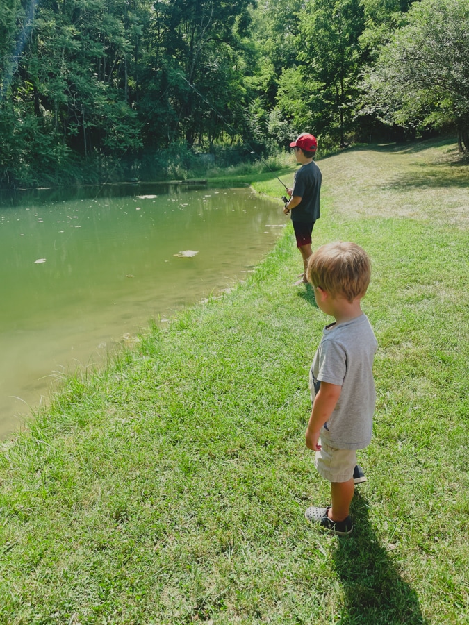 Behind the house there is an ice cold spring-fed pond. The boys took a swim to the dock to find a nice snake waiting there for them! Needless to say I did not put one toe in the pond.