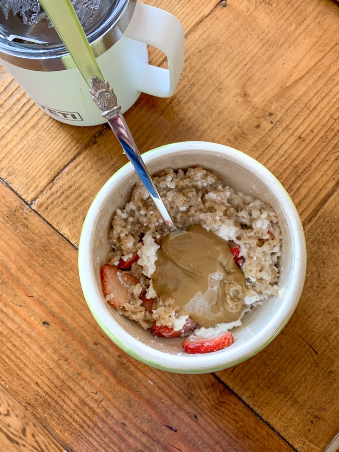 I’ve been craving oatmeal, and I picked up some cottage cheese to cook in. Doesn’t this seem like a blast from the past?! Sunflower butter still going strong.
