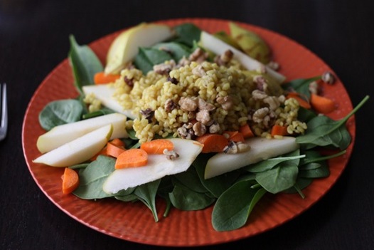 I added sliced pear, carrot and toasted walnuts as well. Some blue cheese would have rocked this salad!