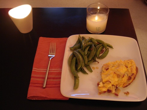 We made a superb dinner tonight!! Apple-Cheddar-Bacon Frittata and Maple Garlic Snap Peas.