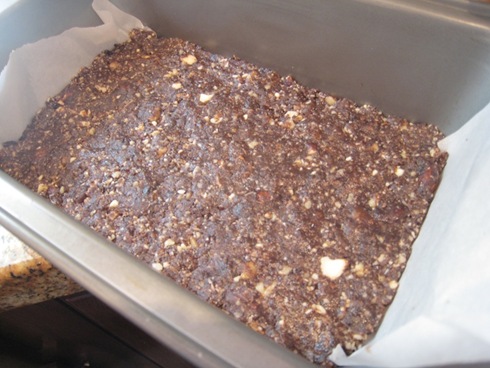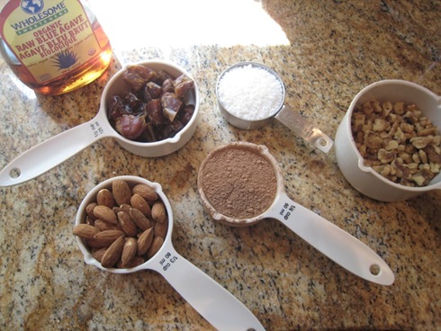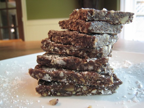 Directions: Take a small 8″ (or preferably smaller) square pan or a loaf pan and line with parchment or wax paper. In a food processor or blender, process the almonds and walnuts until chopped into tiny bits. It is ok if a couple large pieces remain. I actually prefer to have larger chunks of nuts in mine! Remove the nuts and set aside in a medium sized bowl. Next, place the dates into the food processor and process until well blended. Remove date mixture and place in a small bowl. Now take the agave (or honey) and the carob powder (or cocoa powder) and mix together in another small bowl. Add in the coconut and stir well. Take the processed dates and the coconut + carob + agave mixture and place it on top of the nuts in the medium sized bowl. This is where it gets messy and you mix it all together. You will probably start off like I did, with a spatula, and after about 15 seconds you will toss the spatula into the sink and dive right in with your hands. I find the easiest way to mix the brownies is by hand. You may be tempted to throw all the ingredients into the food processor at once, but be warned; when I tried this my food processor got stuck! This is why I have divided it up into 3 parts. Finish mixing well with hands. Now take the mixture and scoop onto the prepared pan. Add powdered sugar for garnish if desired. Place into fridge until ready to eat. Do not leave at room temperature or the brownies will become too soft.