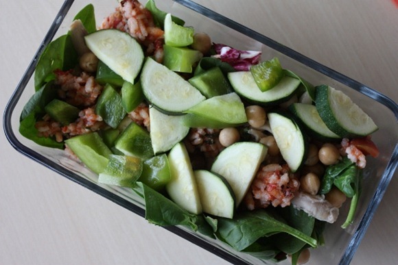 Salad with honey + olive oil + lavender salt plus zucchini, green pepper, leftover tomato basil risotto and leftover chicken and chickpeas.