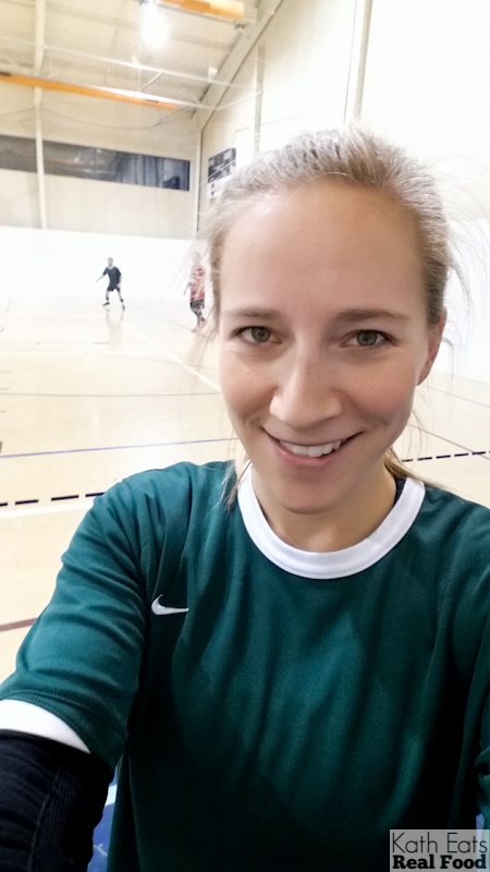 First, some chicken noodle soup (Cook Smarts‘ slow cooker recipe) for a light dinner. It’s so hard to decide what to eat before a game, and I had this about 2 hours before start. I knew if I only had snack foods I would feel hungry before the game, so I chose something with heft but not too much fiber (like a salad). I actually did feel hungry before the game, but I keep dried apricots in my soccer bag and a few of those helped until I got home.