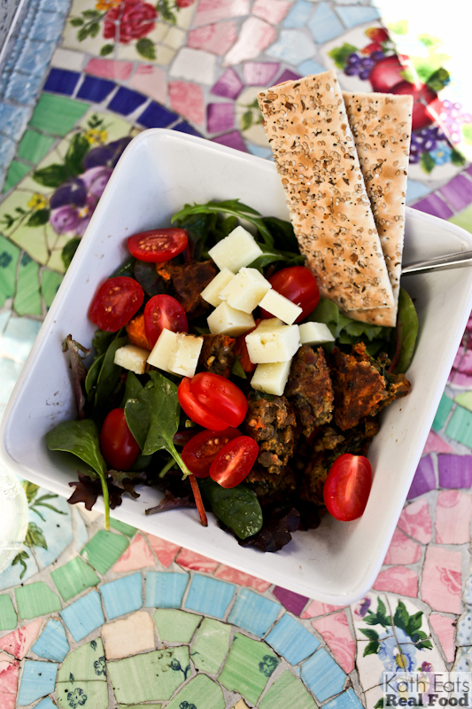 Lunch was a big salad with a No Bull Burger, tomatoes, homemade dressing, manchego cheese and everything crackers.