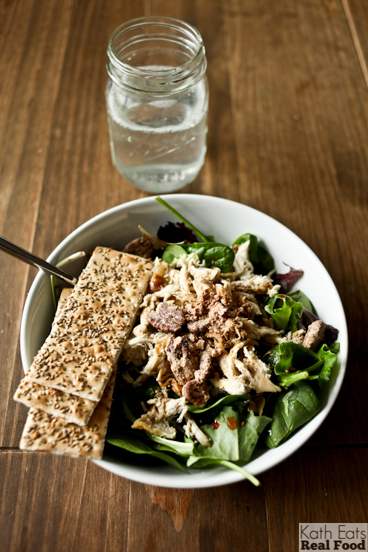 Post-run salad topped with rotisserie chicken, cheese, cinnamon pecans I picked up from WF and everything crackers. Hit the spot! I am now guzzling water in preparation for some drinks tonight. We are going to our neighbors’ house for chili and beer. Oh, and probably some football 😉