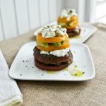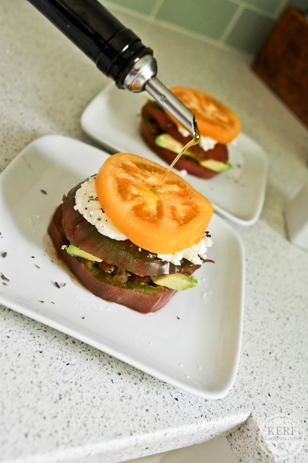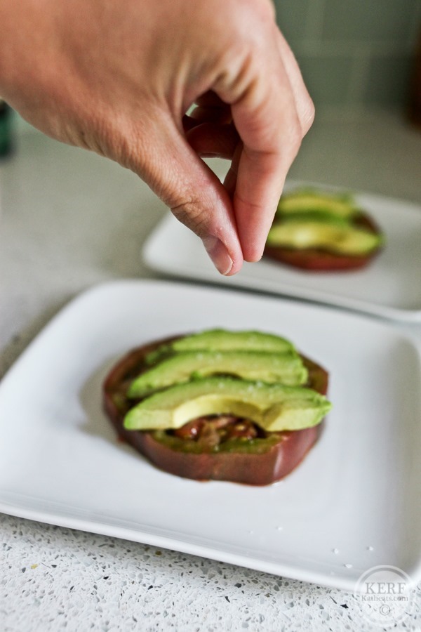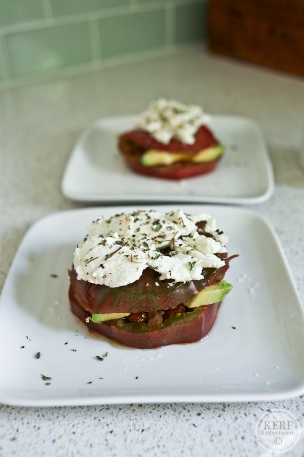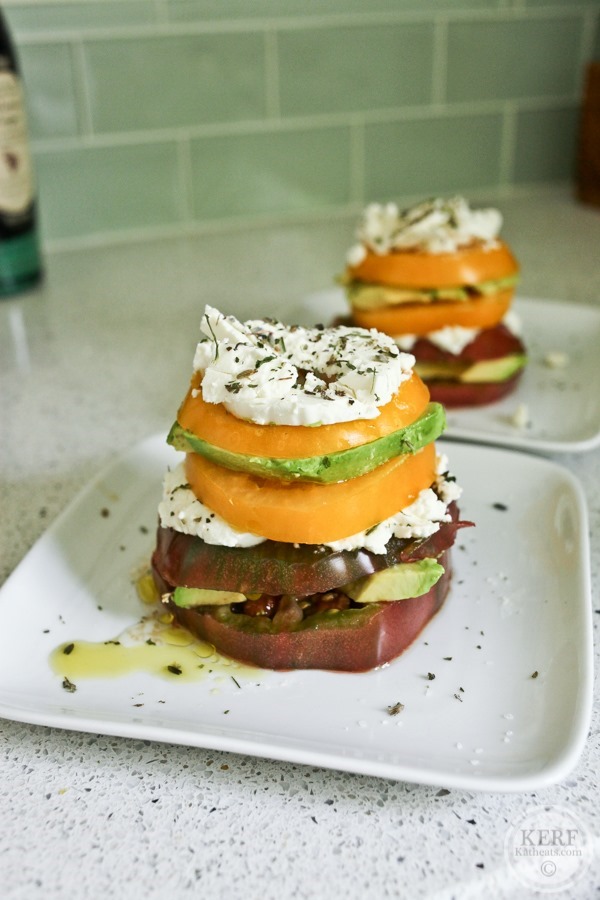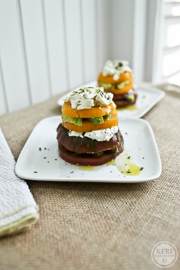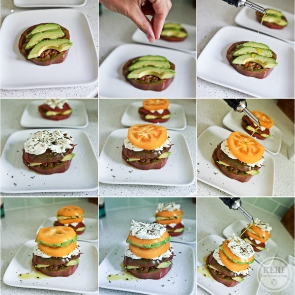 Here is the assembly in a nutshell. You really can do this any way you like. I found that big, wide, even slices of tomato followed by thin layers of avocado and goat cheese worked best. Sprinkle in lots of herbs, olive oil, and salt in between the layers!