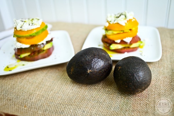 Avocados From Mexico asked me to create a summery salad to celebrate the humble feisty avocado. From side salads to creamy blended dressings to chopped salads and the stacked salad that I created below, avocados go with everything summertime. In fact, I’m just now dreaming up an avocado and watermelon salad with some of my favorite goat feta! Luckily they are packed with good nutrition too – lots of healthy monounsaturated fats and nearly 20 nutrients.