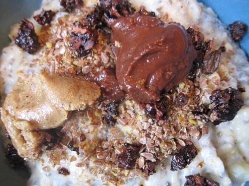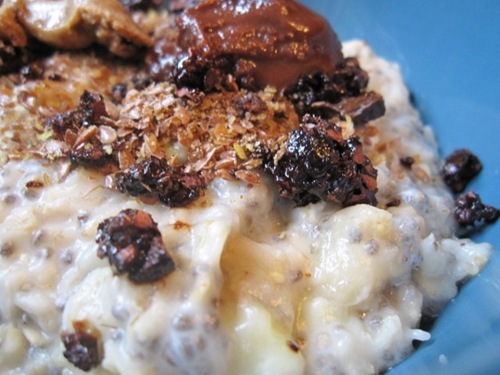 The chia seeds made the oatmeal nice and gooey – in a pleasant way. Kinda like pudding. LOVE LOVE chia seeds. And the nibs are awesome! They remind me of chocolate espresso beans. But I looked twice at the package and realized they are raw, so I was a bit puzzled with the crunchy, roasted flavor/texture. Maybe mine got roasted in the Carolina summer heat? I love them as they are, but anyone know how they are supposed to taste!?