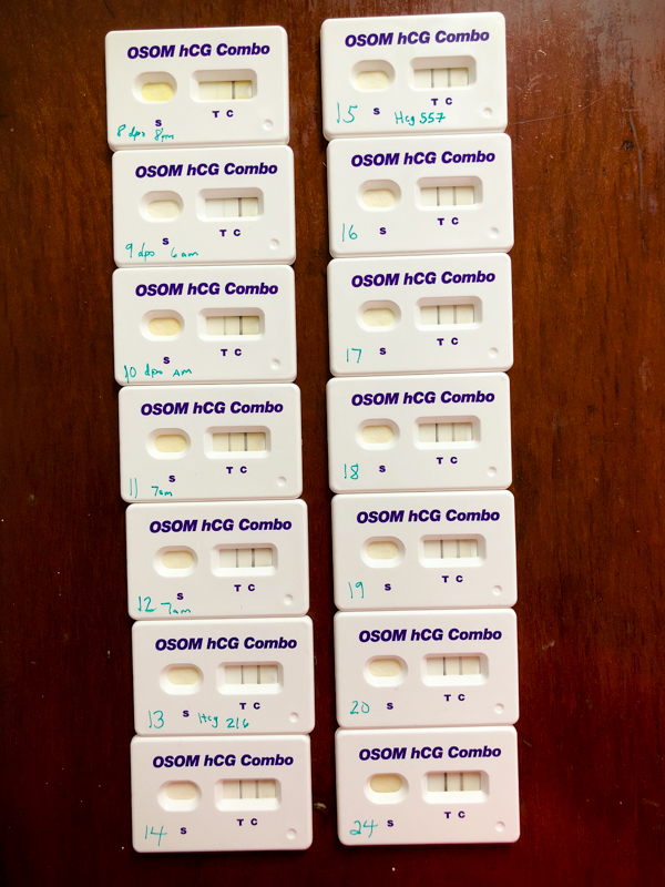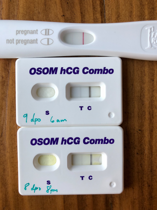 Third time’s a charm just like last time. At the end of our third cycle I started taking tests ridiculously early. I do declare these OSOM tests the best on the market. They are inexpensive (compared to the gold standard First Response tests), better than the cheapest little sticks, and for me a positive showed up a whole DAY earlier than the other test brands (because obviously I was taking them all, haha!) Unlike other tests, when it’s very early, sometimes the OSOM tests take a good hour to fully develop a line. On other tests, if it’s positive outside of the 5-minute timer, you aren’t supposed to consider that positive, but the OSOM tests are different. I went back to look at my test a while later at just 8 days past suspected ovulation, and I could see a faint line had appeared. I also love that the lines on these are super wide, so they are much easier to spot. No squinting necessary. I can’t recommend them enough!