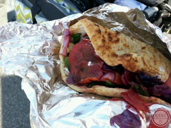 I had a root veggie wrap in naan from Greenie’s, a really fun veggie-centric place. This had everything from beets to sweet potatoes and a spread of goat cheese on the edges. It was awesome!