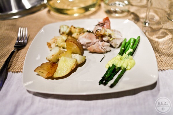 The main course was turkey loin with rosemary, roasted potatoes, asparagus with lemon hollandaise, and cheesy roasted cauliflower