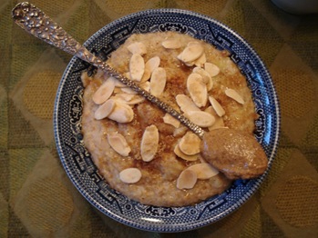We have had this box of Hodgson Mill MultiGrain Cereal in our pantry for over 2 years – I know that because we moved into this house with it! There was only 1 serving left so we’ve been saving it for a time when there’s just 1 of us home. Today was the day. I like this cereal, which is made from oats, oatbran and flax, but it’s not as sweet and creamy (or cheap!) as regular oats. But fun for a change. Today, though, I think the last bit was too old because it tasted a little stale. I put in just over the 1/3 cup serving (to use it up) with 3/4 cup water, 1/4 cup 2% milk, and 1 medium banana.