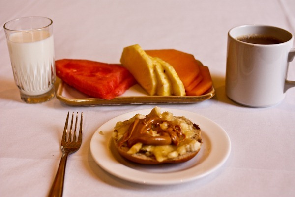 You definitely put those who say they can’t eat healthy when on away from home, to shame. There’s no reason you can’t still eat a balance diet even when your choices are more limited. Got a banana? Check! Got a bagel? Check! Got some peanut butter? Heck yes! And there ya go. Awesome breakfast and very little preparation. Way to be, Kath, way to be!