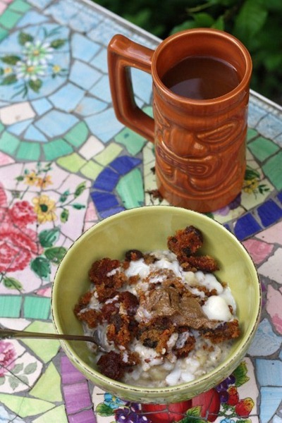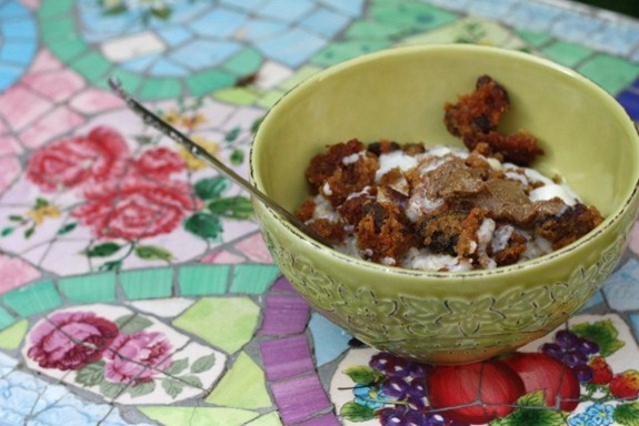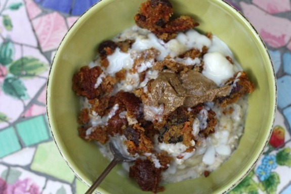 Topped with Carrot Raisin Walnut muffin teacake (from Great Harvest) plus a drizzle of coconut butter and a blog of CVSB.