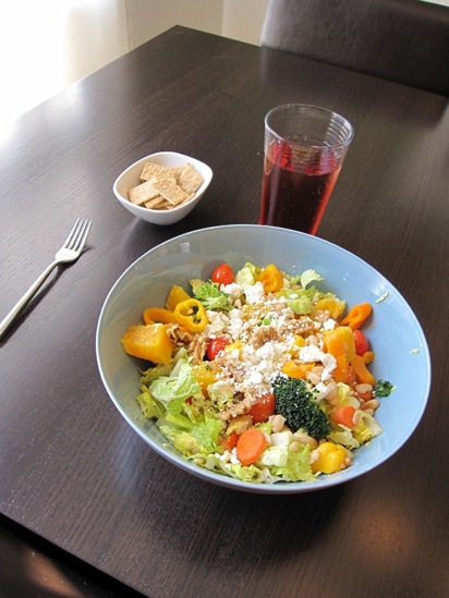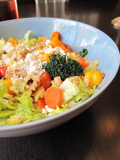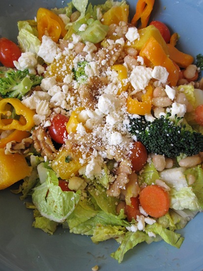 I threw some broccoli, tomatoes, peppers, carrot, and about 1/2 a cup of navy beans into a skillet to heat for 5-8 minutes. Meanwhile I chopped up some romaine, tossed it with fig balsamic vinegar and lemon olive oil, and topped that with orange sections, walnuts and feta. Oh! And a tablespoon of raisins, which was the highlight.