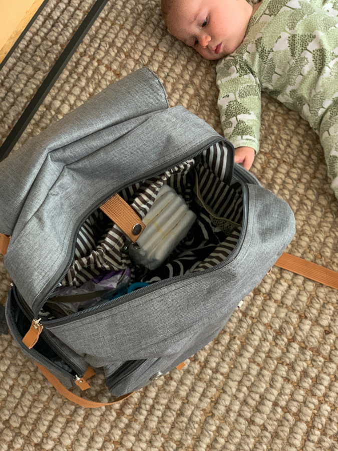 I was hunting for a backpack diaper bag and this one by Parker Baby caught my eye for its style and colors. It is called The Birch and of course it became The One.